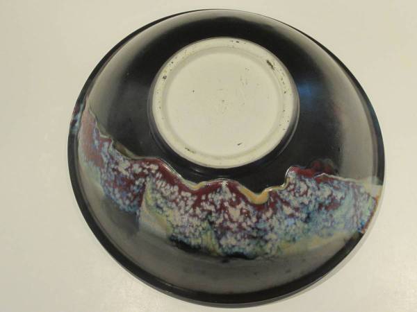 Beautiful glazed ceramic bowl. Classic style. Black glazing with red/blue/white yellow highlights. Approximately 4-1/2 inches tall by 10-1/2 inches in diameter.