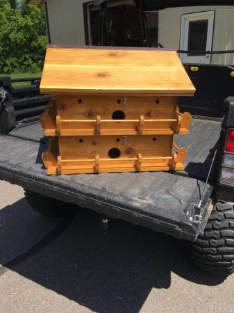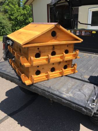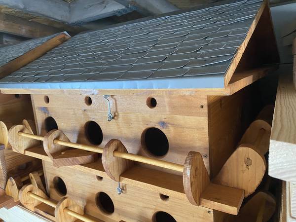 Purple Martin House, 16 units. With metal roof. The whole bird house is made of Cedar. Each floor opens for easy access to clean out in Fall. Each apartment is about 6x6x6 inches. The entrance holes are offset to protect babies. Outside is finished with a clear coating of Super Deck.