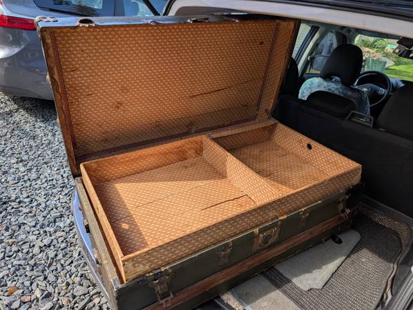 Antique Metal and Wood Steamer Half Trunk Original Interior Lining - $30