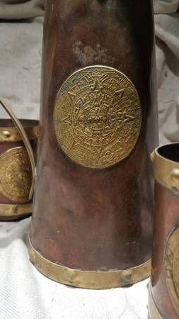 Rare antique copper and brass hand-made cups (large coffee cup size) and pitcher (about 12" tall) set with Aztec calendar, these are thick and heavy, made in Mexico supposedly in the 40's or 50's....