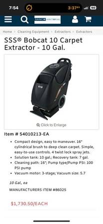 SSS® Bobcat 10 Carpet Extractor -Compact design, easy to maneuver -16" cylindrical brush to deep clean carpet -Simple, easy-to-use controls -4 twist lock solution spray jets -Cleans up to 5,000 sq...