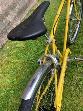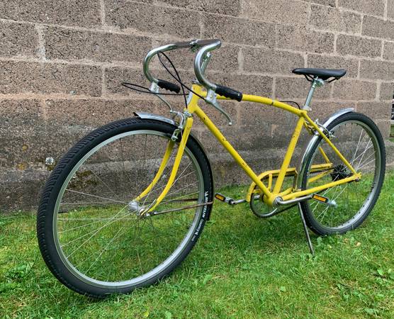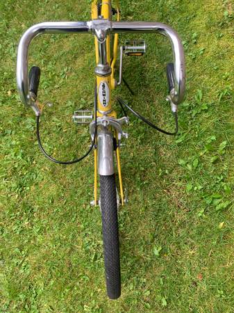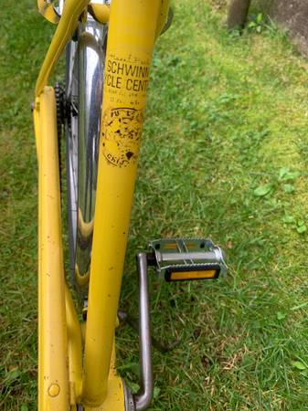 Not sure of the year. Bought it locally from a guy who had it in his barn…. from a St Paul Bike shop! It was already set up with the drop bars and brake handles in this format. Replaced the 27” Scwhinn steel rims with some 26” aluminum ones. Original rear 3 speed hub was toast (tried rebuilding it) so updated instead. Cold set the frame to fit wider hub. New brake calipers for the longer reach. Original brake handles and handlebars and grips. Brand new Micheline Country Rock 26x1.9 tires and fresh inner tubes. New rat trap pedals. Cleaned all bearings. Cleaned and waxed the frame. Fenders are original… rear one was a bit banged up so trimmed off those bits for a cooler look and added some new mounting points to the front fender stays for a closer fit. Add a rear derailleur if ya want gears or keep it single speed. Make it yours!