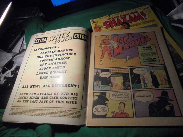 This reprints the very 1st Captain Marvel story of how Billy Batson met the Wizard and became Captain Marvel by saying the word SHAZAM! His firstadventure finds him taking on a crime syndicate trying to remove all the Radio Stations! The rest of this first issue of WHIZ COMICS follows: IBIS THE INVINCIBLE sees Ibis return from the dead as a Mummy! GOLDEN ARROW is about an orphaned kid raised by animals who becomes an expert in Archery! SPY SMASHER saves some secret Government plans on a blimp! SCOOP SMITH tracks down some stolen Radiation! LANCE O'CASEY and his pet monkey Mr. Hogan have an adventure saving a man ad his hottie Daughter on a remote South Sea's Island! DAN DARE in "Seals of Doom" finds the Detective summoned to a Florida Mansion to solve a murder mystery!