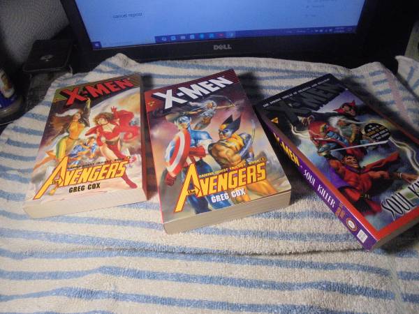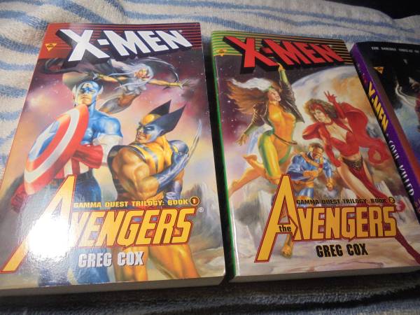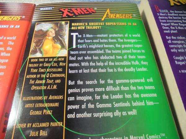 X-MEN/AVENGERS : GAMMA QUEST TRILOGY Books 1 & 2 (of 3), 1999! Written by Greg Cox! The X-Men--mutant protectors of a world that fears and hates them. The Avengers--Earth's Mightiest Heroes, the greatest super-team ever assembled. When the Scarlet Witch of the Avengers and Rogue of the X-Men both disappear under mysterious circumstances, each team's search leads them to more questions than answers. Desperate to recover their missing teammates, they must join forces to uncover the truth. But their efforts will bring them up against a foe with the deadliest power of all: to make them turn on each other! There are apperances by The Hulk, Nick Fury and S.H.I.E.L.D., The Riot Squad, The Leader, Doc Sampson and more!! The cover paintings are by Julie Bell and the interior Illustrations are by George Perez!!