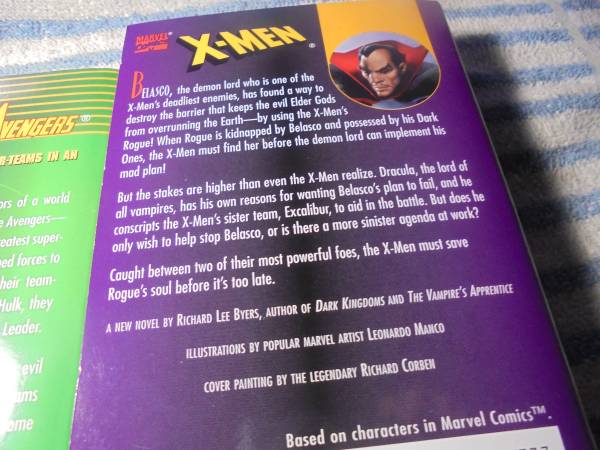 X-MEN: SOUL KILLER, 1999, by Richard Lee Byers! The demon lord Belasco plans to use Rogue to bring the evil Elder Gods to Earth! The X-Men and their Allies Excalibur must stop him before Rogue's very soul is destroyed! Their unexpected -- and untrusted -- ally is the Lord of all Vampires: DRACULA, who has his own agenda! Great stuff!! The cover painting is by Richard Corben and interior Illustrations are by Leonard Manco!!