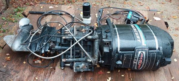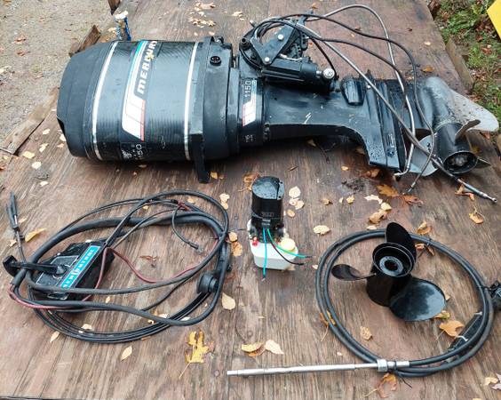 Complete engine, all controls, steering cable, NEW trim pump, NEW prop Took this off of a boat my son recently pruchased, was told it runs. I DID NOT attempt to run this engine! Everything in photos...