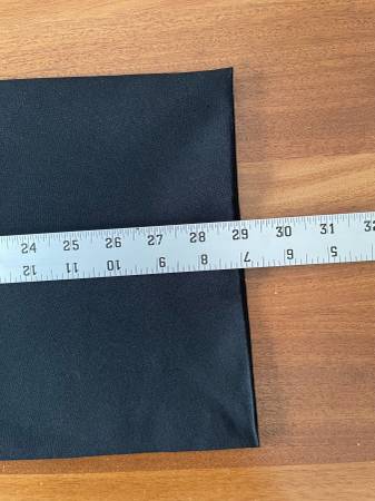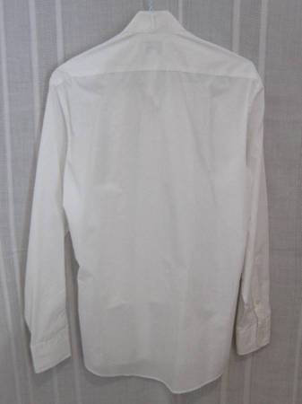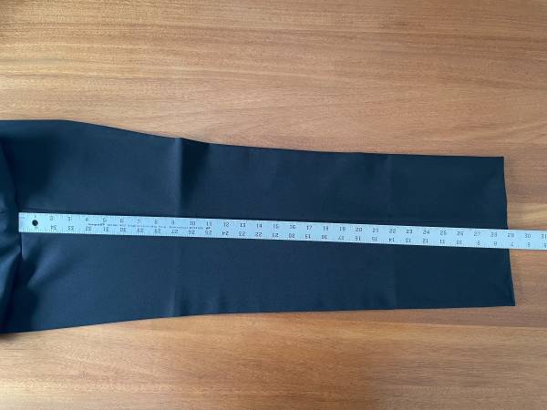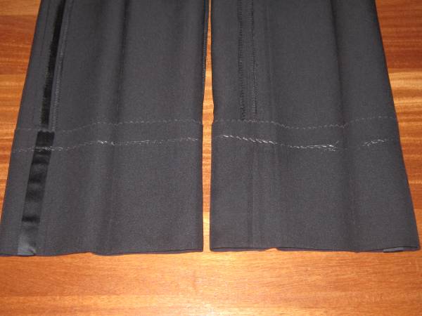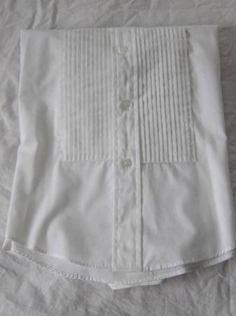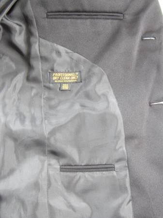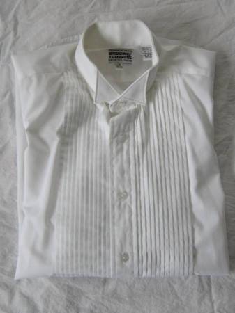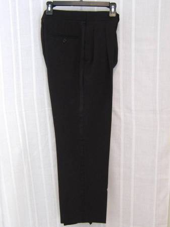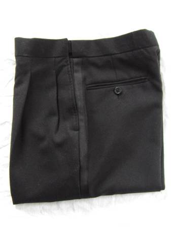 The jacket in size 36S is lined with no tears or stains, with a two-button front closure, several roomy inside pockets, and two false front pockets for a detailed look. Matching 30W tux pants, adjustable-waistband, comfort gore-elastic inserts for a great fit, easy-care wrinkle-free polyester material wipes clean. The slacks are currently hemmed to 29 inches but has a generous 7-inch inside turned-under-material so slacks could easily be shortened or lengthened with a quick hem-stitch with needle and black thread. Included is a Broadway Tuxmakers white pleated tuxedo long-sleeve button-down shirt in size Small 32/33 shirt (65% polyester, 35% cotton)for a finished look.