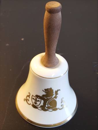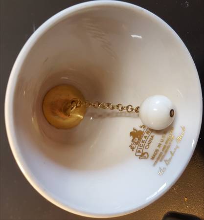 Porcelain Danbury Mint bell with wooden handle. Labelled Made in USA, Pickard China. Part of the Great porcelain houses of the world series. 5 inches tall by 3 inches in diameter