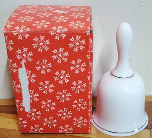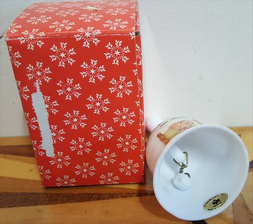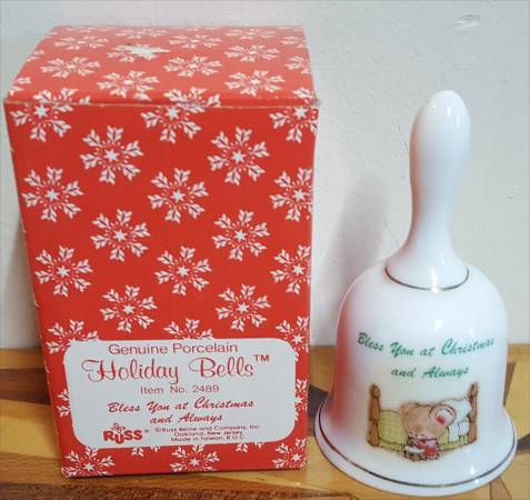 Here is a porcelain Christmas bell with gold trim made by Russ Berrie and Company that still has it's original box and tag. The box does have a small piece of the surfface design torn as seen but is in decent shape otherwise. It has a mouse kneeling by a bed graphic on one side and the words "Bless you at Christmas and Always". It is probably vintage as it was inherited from an elderly aunt of ours. It is about 4 inches tall by 2 inches in diameter. As nice as it is, we just don't have room to display it with all the other Chrismas things we have so it's time someone else enjoyed it and made some new memories rather than just having it sit in a closet here.