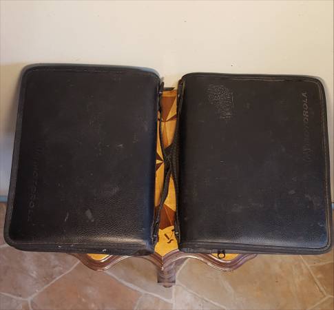 Here is one of the early type cell phones that is becoming quite collectible. This is more complete then most you will find since it has the original paperwork, car charger, and antenna as seen. This will come with an extra zipper pouch or bag too. Both zippers work as they should and there are no tears or other major damage to the bags though there is a little glue residue from an old sticker on them. These often sell for $35 or more with shipping on Ebay without all the paperwork or extra bag so save a little and pick this up locally. If you are a collector of vintage electronics, this makes a great conversation starter or show piece.