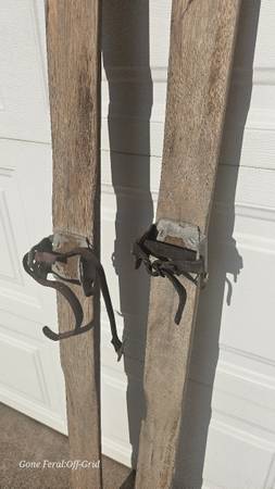 One pair of antique wooden skis with original metal/leather bindings – One binding strap replaced long ago with another aged leather strap (adds to the authentic “well-traveled” look). Solid enough for display and loaded with character from decades of use.