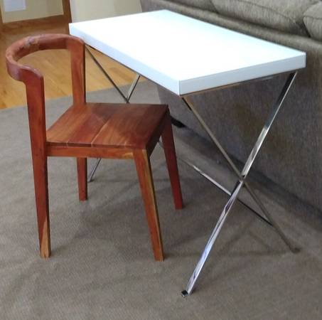 *Desk is a high gloss/glassy finish with (steel) chrome legs in a 'X' configuration which makes it sturdy.