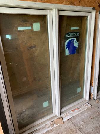 Winsor casement windows, 49 inches wide by 55 inches high, clad exterior, color clay, wood interior. Screens included, stored inside. Available at $300 per window.