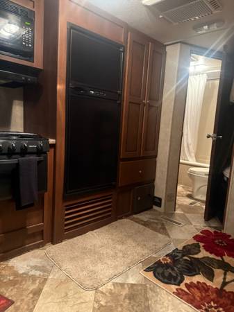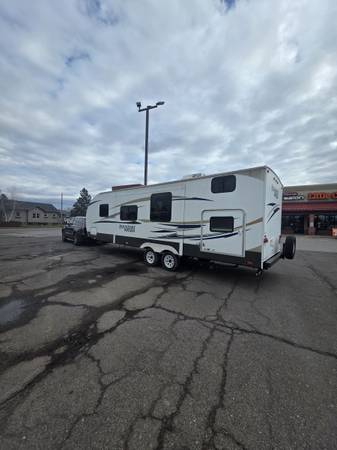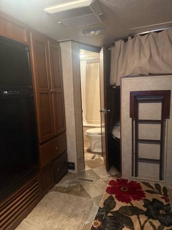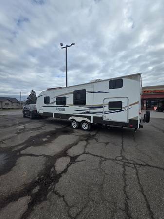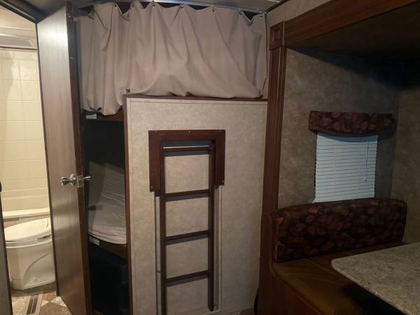 2015 boundry waters camper trailer large bunk beds couch folds into bed table folds to bed master bedroom with door two flat screen smart TV'S tons of storage outside shower microwave fridge and stove with oven cold air-conditioner hot heater bathtub shower and bathroom has a door to use from the outside without walking through camper
