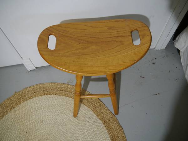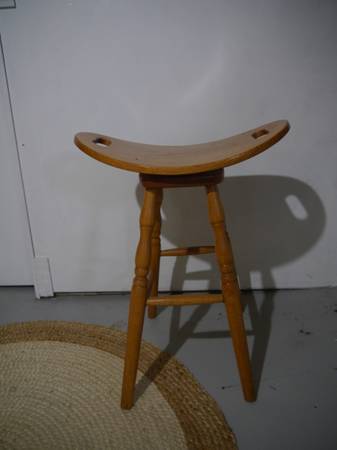 This is a very nice unique stool made of solid wood and the saddle seat swivels. It measures 25" tall to the seat You haul cash only Please email me or call Call not text