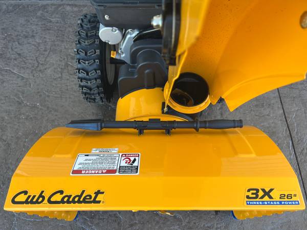 Very clean 26 inch Cub Cadet 3X snowblower. 357cc overhead valve 4-stroke engine, three stage technology. Has both electric start and manual pull start (starts easily and started first pull this Fall). Trigger controlled power steering. Six forward speeds and two reverse. Heated hand grips. Dual LED headlights (both work great). 200 degree chute rotation, and adjustable chute height control via handle on top. Rated to snow up to 40 feet. Large Carlisle XTRAC 4.80 - 8 tires with excellent grip and still have the "new tire hairs" on them. Poly skid shoes that don't catch the ground or leave rust stains on the garage floor. Has fresh non-oxy fuel in it and recent 5W-30 full synthetic oil change. Includes chute-clearing tool and spare sheer pins. Very clean overall with low use. Delivery negotiable. $1000 (firm/cash).