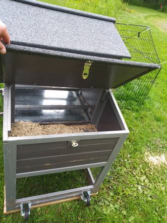 Chicken tractor/coop for four adult chickens, new condition, easy to move, two fitted shade covers approximate 9' 7" X 3' 6" caged area.