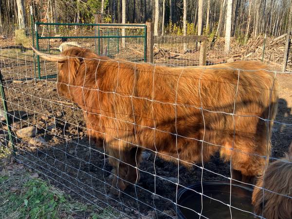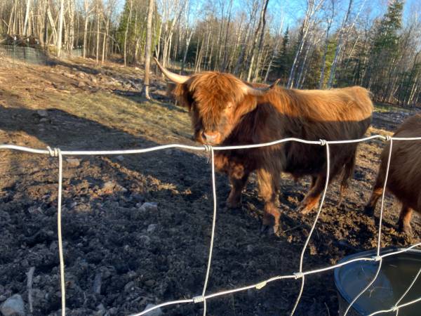 Fergus MacFurPants, 3 year old brindle Highland bull, is looking for new pastures. He isn’t tame, but has a calm disposition. He will take treats from my hand and lets me boop his nose.
