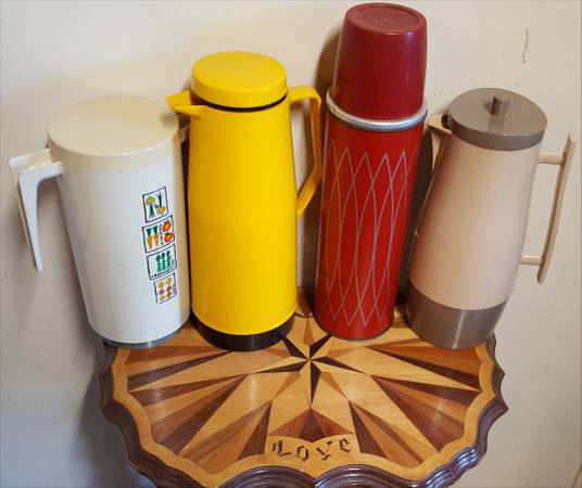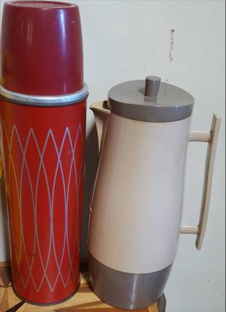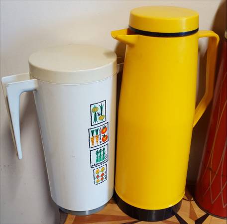 2. Yellow Thermos brand insulated pitcher. Plastic. 5.5 in wide x 4 in deep x 12 in tall. This one will keep your coffee warm for a while, or your drink cold. We inherited these and don't really have a use for this many of them.