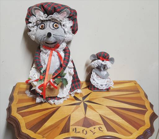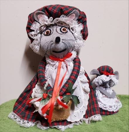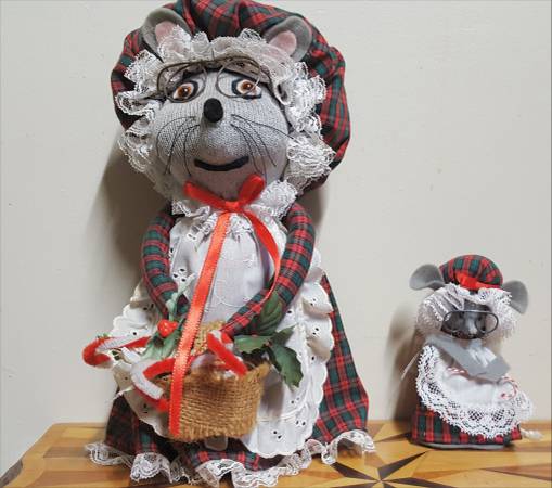 Here are two cute Christmas mice to make your holiday festive. The larger one is 11 inches tall by inches 5 wide by 5 inches deep . The smaller one is 5 inches tall by 2.5 inches wide by 2.5 inches deep. As nice as they are, we recently inherited three different estates worth of Christmas items and just don't have room in our small house for all of the nice things, so these need to go to someone who can enjoy them rather then just sitting in our closet. These are built on a weighted -possibly sand filled?- base so are more difficult to tip over if bumped on a table or shelf by kids or pets.