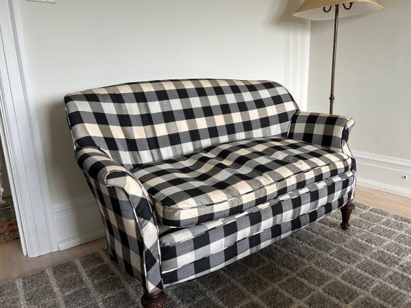 Two beautiful custom upholstered two seater black and white silk down filled sofas / loveseats. Clean in beautiful condition. Sold as a pair $600 for both. Bring help to move into vehicle....