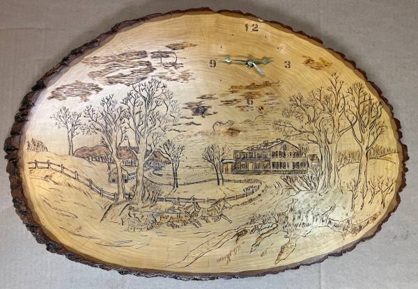 Digital Clock set in wood-burned carving of a winter sleigh-ride / sleigh-race. The basswood slab is finished with the artwork by local artist, but it is anonymous. It measures 26"W x 17 1/2"H x 1 3/8" thick; it weighs 7#. Hangs securely on a heavy wire. It keeps perfect time on a half-dead AA battery: even though the battery will not work in your remote control, it will run the clock for a year. Great clock to hang in your shop! The back is rough-cut from the basswood tree.