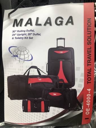 New Malaga 4-Piece Expandable Rolling Luggage Set. High density polyester, recessed metal ball bearing in-line skate wheels, push button retractable handle, fully expandable for additional packing capacity, dual bucket tie-belt + mesh pocket for necessities, hanging hook on the toiletry kit.