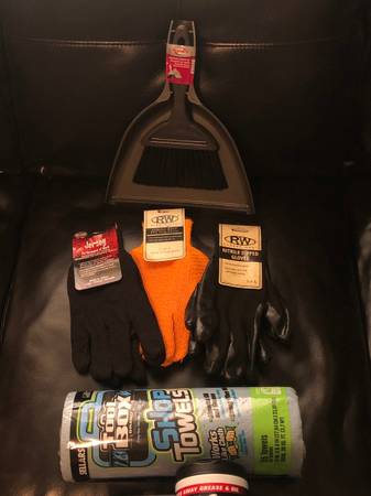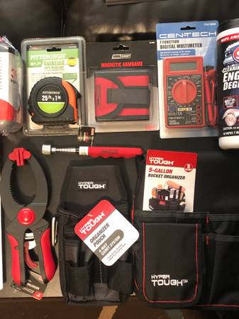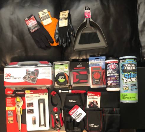 New Tool/Garage Set. 39 piece tool kit, 7 function digital multimeter, flashlight, gloves, hand broom & dust pan, degreasing wipes, magnetic arm band, extending magnetic wand, bucket caddy, tape measurer, clamp, fast ratcheting adjustable wrench, organizing pouch, shop towels. See pictures for details.