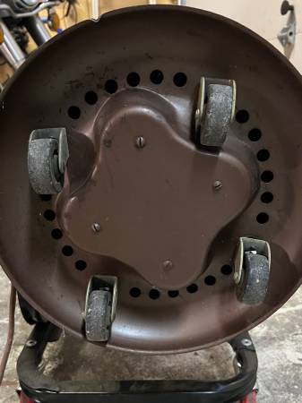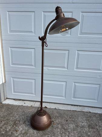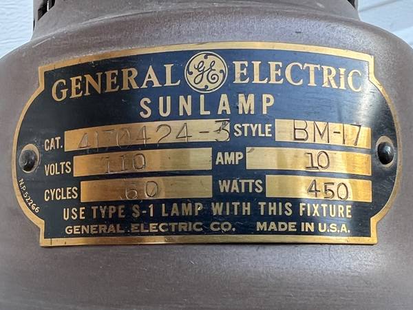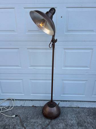 This lamp was prescribed for Grampa when he was a child recovering from a mild case of polio; it's clean in great shape. Perhaps you’d like 450W of soft radiant heat. The head pivots to 3 angles. The lamp is 67” at its highest, 61” at its lowest. The reflector is 15” diameter; the base is 13” diameter. The lamp weighs almost 30# but it glides effortless on 4, 2” swivel casters.