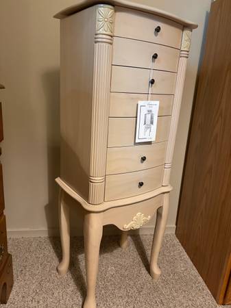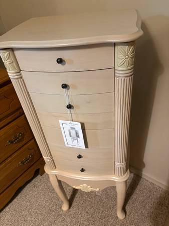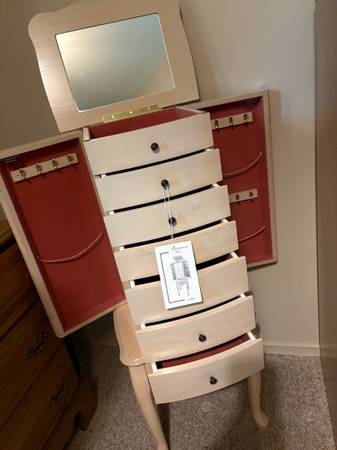 Jewelry armoire with mirror. Stores all types of jewelry. 40” H x 16”D x 12”W. Excellent condition. $200 new, asking $75.