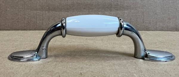 Cabinet Pulls - White/Chrome. These neo-colonial pulls are clean; mounting screws are included. The pull is 5" overall length x 1 3/8" high; the mounting holes are 3" on-center. The white ceramic barrel in the middle is 5/8" diameter. You can buy these at Menards for $6 each.