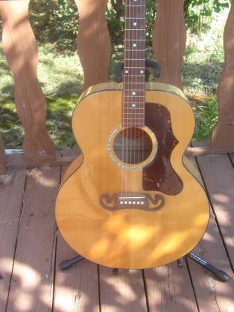 Made in Bozeman, MT in 2003. Maple back and sides, mahogany neck, factory pickup. Cosmetic imperfections (finish checks) do not affect structure or sound. Original Gibson hardshell case in good condition. If it's listed here, its available. In person, cash sales only. Can deliver Two Harbors to Duluth. You won't find a better sounding J100 at a better price.