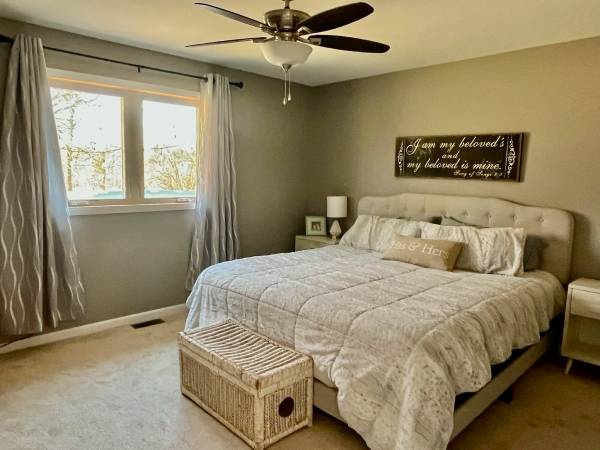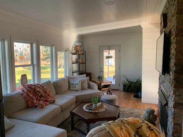 Recently remodeled ranch style 4 bedroom, 4 bathroom farmhouse on 80 acres at the end of a dead end. Land is a mix of hayfield, pasture, and woods which includes trails and a deer stand. The 10+ acre 40 foot deep lake is almost entirely on the property.