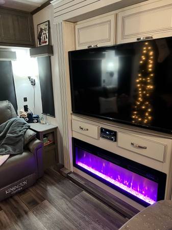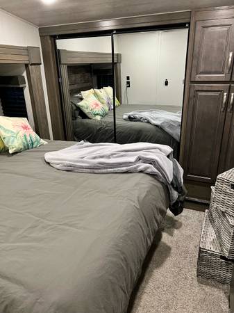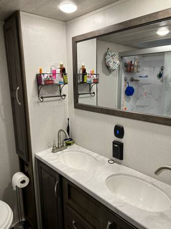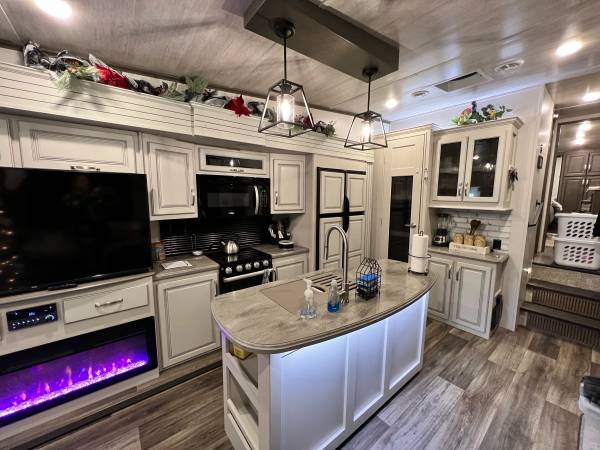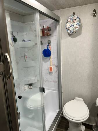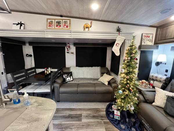 This is a great 5th wheel that I comfortably lived in for about 24 months. It had one previous owner. It has the 4 seasons package, and the add ons of two solar panels, an inverter, second A/C, updated touch reading lights over bed, roller shades in the living room/dining room, various baskets for storage in bathroom and bedroom, macerator pump, one 100 foot heavy duty garden hose for waste, one 100 foot heavy duty garden hose for fresh water, 40 feet of Camco RhinoEXTREME 3inch waste hose, Power Watchdog Surge Protector/ electric meter, 50amp power cords (app 90 feet), and possibly more stuff included. This unit has 3 slide outs. One more years of a transferable warranty that covers everything.