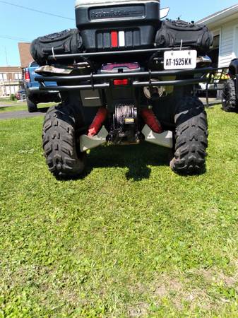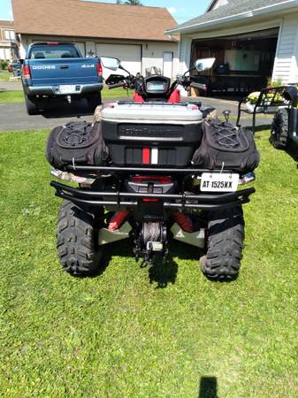 This atv is set up with all options. It has all 4 shock covers, front and rear A- arm guards, 2500 lb winch, three gallon gas can mounted on top of front rack, a map bag mounted in front of rider, it also has 2 OEM air filters 1 for use the other serviced and ready to use when other one is dirty and needs to be replaced. hand and thumb warmers, 60" front mounted snow plow, 20 inch front LED light bar, Tiger Tail retrievable winch system on rear of ATV, Newer tires with about 700 miles on them. They are 25x8x12 and 25x10x12 Tusk terraform ATV tires. ATV has 2,800 miles but will go up as the season goes on it has 151 hours on engine. Oil has been changed every 500 to 750 miles. It also has 1" wheel spacers. This ATV has been meticulously cared for. This machine has Mirrors, a muff pot on exhaust pipe to warm up your food on the trails. Handguards, LED light bulbs in all three lights on the front end I replaced the halogen with top of the line LED bulbs. Comes with bag storage on rear and cargo box this ATV Burns no oil, runs beautiful. I replaced the 18 gram roller weights with 16 gram to give the machine more low end grunt on the trails. Max speed is 62 miles an hour before bouncing off the rev limiter plenty fast for the trails I ride. I like the torque it has with this weight set up. Also has a new EPI secondary yellow spring installed to help prevent any belt slippage . Also put a Whiskey Bent exhaust tip on pipe to give her a nice sound without being overly loud. Belt was just replaced but old one was still perfect. Now it has a spare belt, but u wont need it. Belt dont slip. These atvs have a great clutch system. Also comes with front and rear bumpers. Will not be disappointed with all that is on this machine and what you are getting for the price. You will never find an ATV at this price with this many accessories. This atv was also sent to Mac Sport and Marine in Superior Wisc to have the valves adjusted.