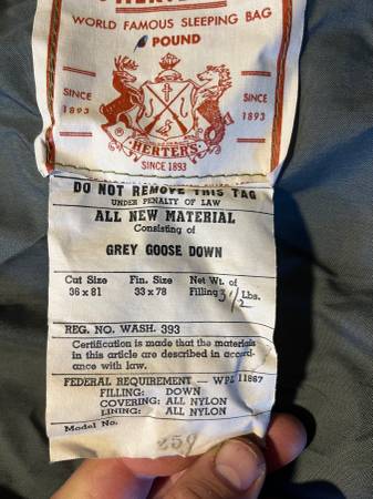 Herter’s Grey Goose Down Sleeping Bag Great condition. Model 250. 33” x 78”. Tag reads Herter’s World Famous Sleeping. Ag Since 1893 Cut size 36 x 81 Fin. Size 33 x 78 Met Wt of Filling 3-1/2 Lbs...