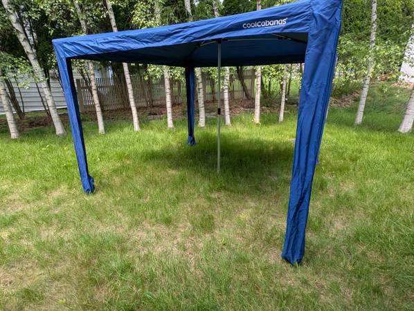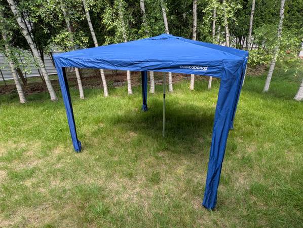 Used once! UPF 50+ protection. 8fy by 8ft 64sf of shade. 1min to put up or take down. Held up by sand, stakes or rocks. Very secure in wind. For beach or camping. New was $300. There are cheaper...