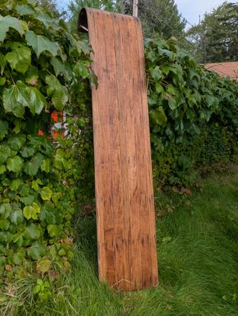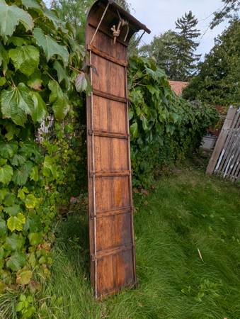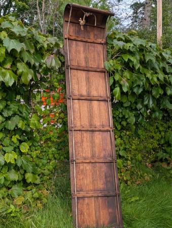 18in wide by 7ft long. No broken slats. Could be used for display or as a toboggan. Leather rail rope loops.
