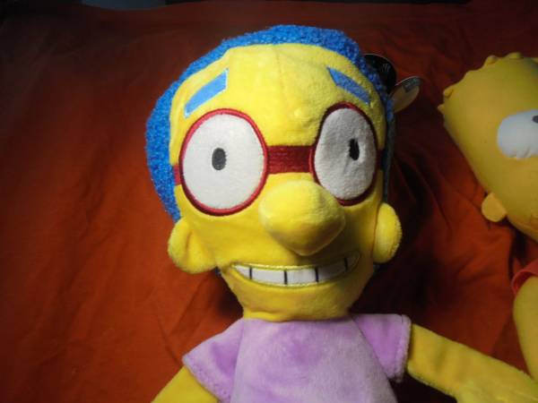 The Bart Simpson's Plushy is in great condition except for two small splits near his left armpit (which can easily be sewed) and is very clean and colorful. while Milhouse is in Extremely High Grade condition and extremely clean!! This has the original Tags and Milhouse is dressed in his usual attire! This is the ONLY ONE ONLINE and This is BRAND NEW with the original Tags!