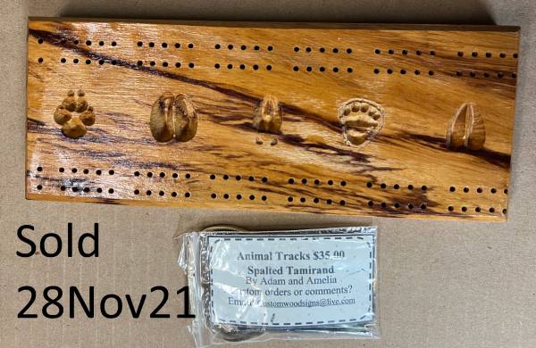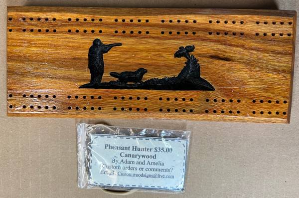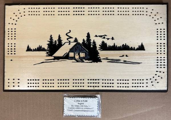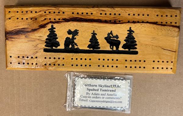 Cribbage Boards, Locally Made. Many designs available; please browse the pics. Pegs are chrome-plated, re-purposed pins from an industrial press. 6 pegs are included with each traditional 2-track board; 9 pegs are included with each 3-track board. Most boards have felt backing. Prices are reduced from original listing; discount of $5 off each individual price if purchasing 2 or more boards. Board design, dimensions, and species of woods is listed below.