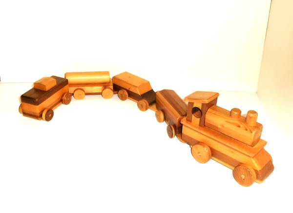 Vintage 5 Piece Wooden Train Set. H. W. Crawford. Rough edge on a piece of the engine roof. Engine is 7" long and 5" tall.