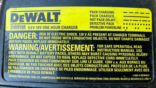 DeWalt 18V Charger (DW9108), 9.6v-18v 1 hour. $5