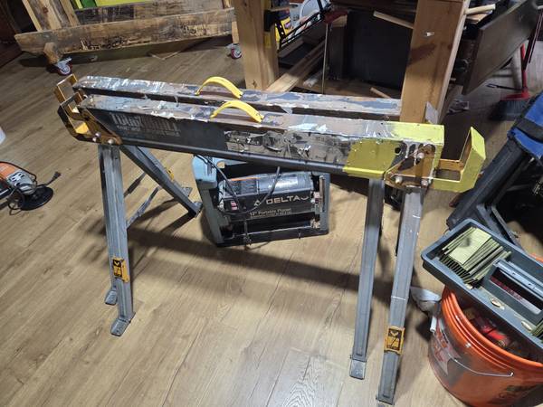Saw horses, folding, some rust and paint splatter but still functional. $15