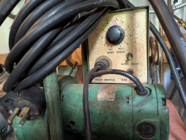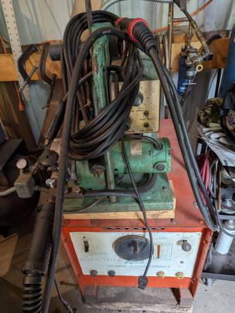 Feeder: Linde industrial wire feeder runs dual -shield and self shielded flux core. You can't run solid wire on this set-up because welder is constant current not constant voltage. If you have a constant voltage welding machine you can run any wire, (solid or flux core.) Has pretty long stinger and ground leads plus a long lead from welder to feeder so you don't have to move the welder. Just place or hang the feeder by the work. If you just want the welder $300.00, if you just want the feeder $300.00, both for $500.00. If you buy both the welder and feeder I'll give you 3 unopened 50 pound kegs of Lincoln 3/16" 6010 for free. Comes with 15 foot 250 amp MIG Gun.