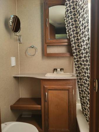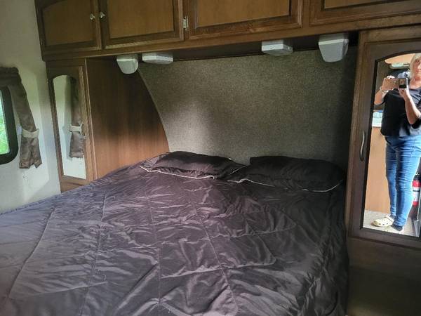 2015 Coachman Freedom Express travel trailer. Queen size bed, 3 bunks, table, sofa, outside kitchen with second refrigerator, and large slideout. Stored inside