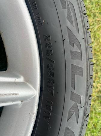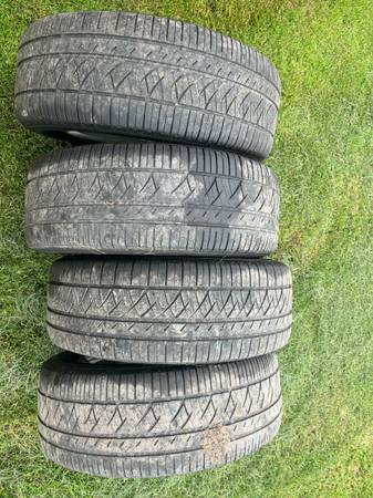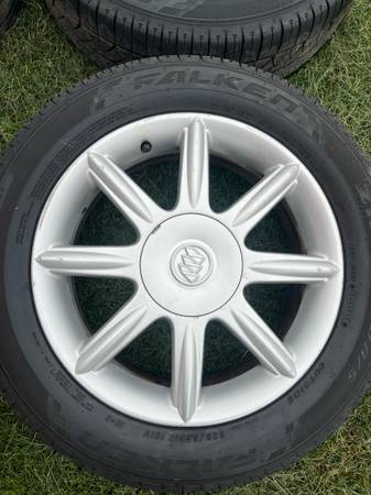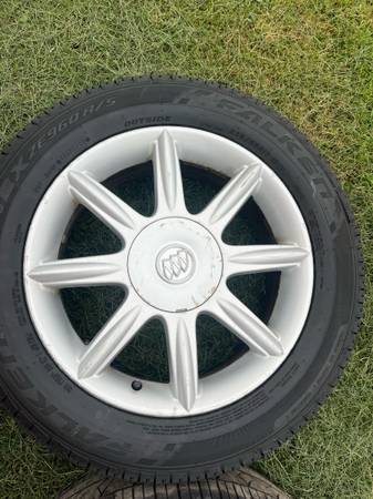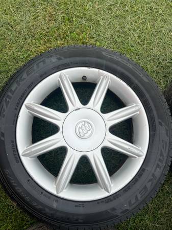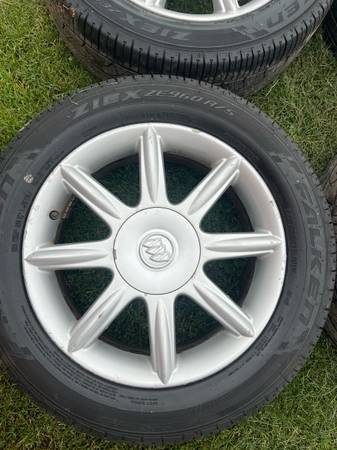 Wheels and tires from a 2005 Buick Lacrosse. Wheels are factory Buick 5x115 bolt pattern. Tires are 225/55r17 Falken ZE960 A/S with a decent amount of tread left. These were an extra set for a car I sold. All tires hold air. Call Brody at 218 five nine zero 2660.
